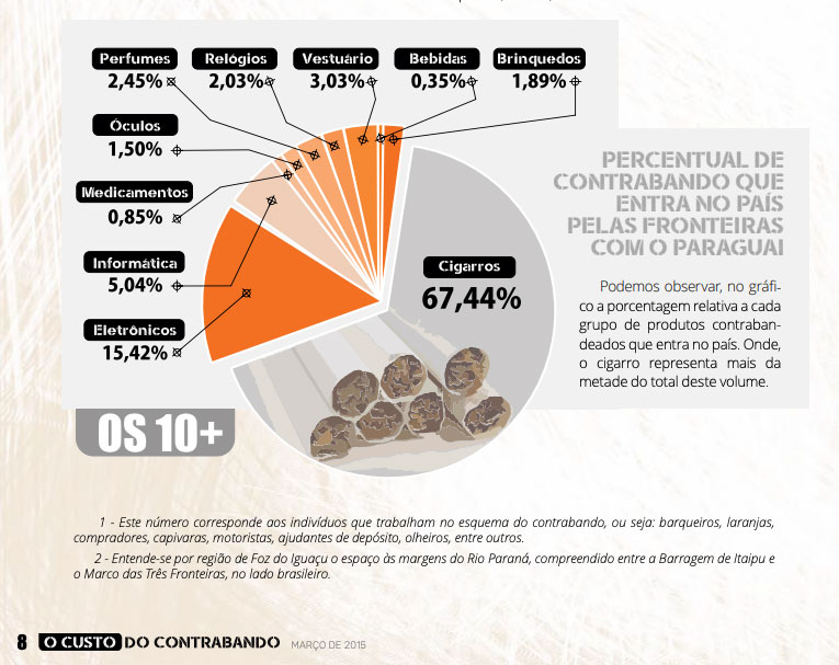 No balanço aduaneiro de 2014, o cigarro representou 28,6% das mercadorias apreendidas. Para conseguir chegar aos 67%, explica, o informe nacionaliza os dados de Foz do Iguaçu e exclui da lista quatro itens: veículos, outros produtos, mídia ótica gravada e mídia ótica não gravada. Depois nacionaliza os mesmos dados usando os números preparados.