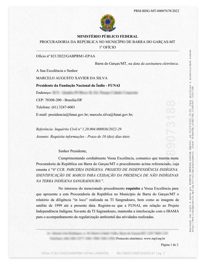 Logo após a multa e o embargo, o mesmo procurador do MPF que havia dado aval ao projeto Agro Xavante em novembro de 2021, Everton Pereira Aguiar Araújo, abriu um inquérito para apurar “a cessação de presença de não indígenas” na TI Sangradouro.