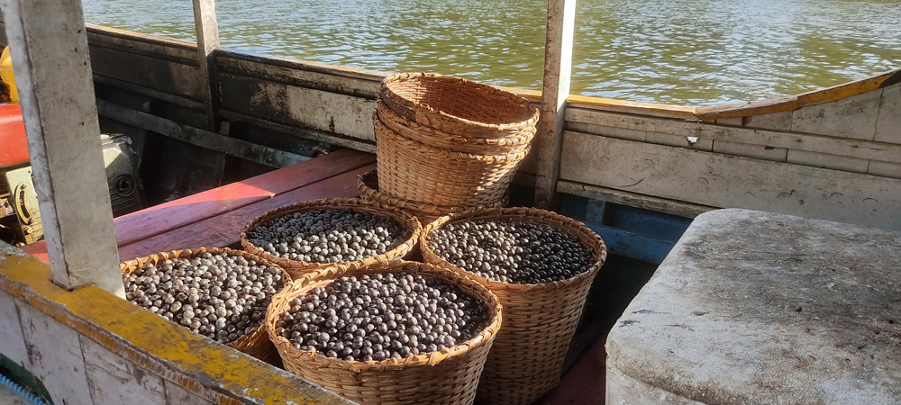 A origem dos paneiros, que comportam 14kg de fruto, muitas vezes é desconhecida. Os vendedores da feira resumem a poucos nomes as regiões de produção, o que não condiz com a quantidade de comunidades extrativistas. A informalidade relatada anteriormente por Letícia, do Marajó, resulta nessa perda de informações pelo caminho. Todo esse açaí, que vem de diversas diversas comunidades do Pará, chega misturado ali naquele chão de pedra do Ver-o-Peso, onde é vendido.