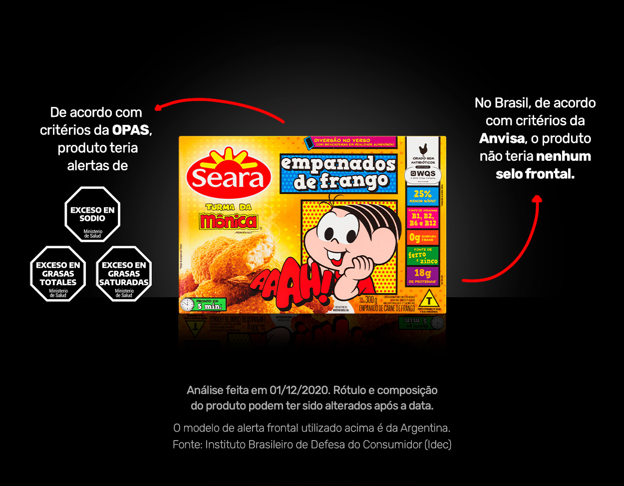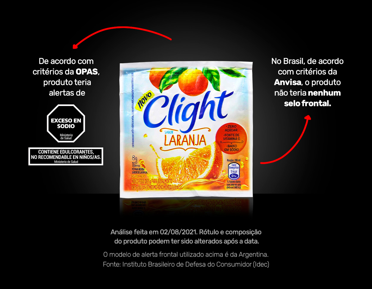Usando o perfil da Opas, um suco Clight teria um alerta para excesso de sódio e outro para a presença de edulcorantes. Danoninho teria um alerta para excesso de açúcar e outro para gorduras saturadas. O nuggets da Turma da Mônica teria alertas para excesso de sódio, gorduras totais e gorduras saturadas. Mas, ao se adotar os critérios da Anvisa, todos ficariam livres da lupa.