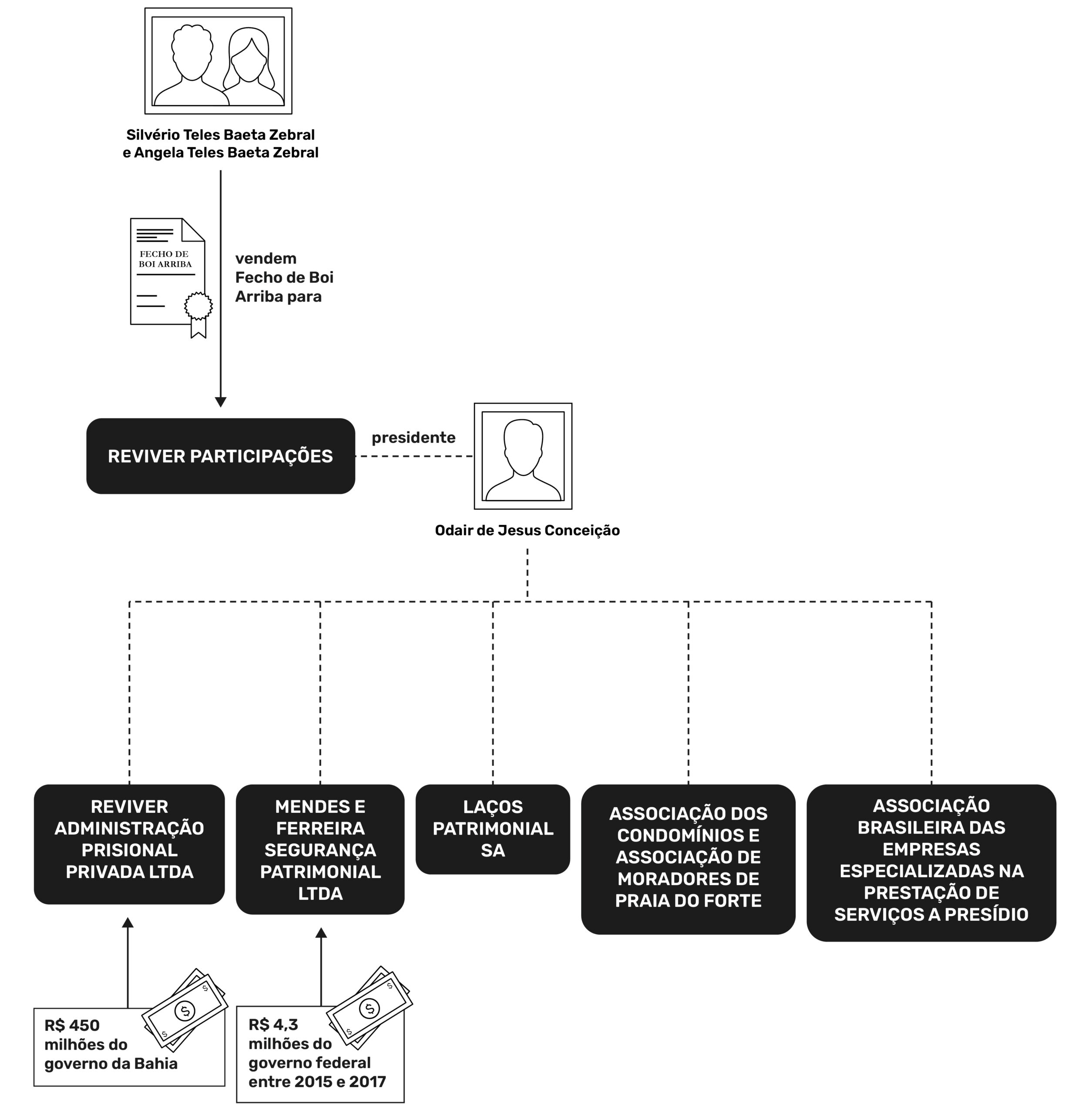 Uma das empresas de Conceição, a Mendes e Ferreira Segurança Patrimonial Ltda, recebeu R$ 4,3 milhões do governo federal entre 2015 e 2017. Conceição é o presidente da Laços Patrimonial SA, da Associação dos Condomínios e Associação de Moradores de Praia do Forte, Reviver e Associação Brasileira das Empresas Especializadas na Prestação de Serviços a Presídios. É ainda sócio da Mendes e diretor de 18 empresas. Pela administração prisional, a Reviver recebeu 1.147 pagamentos do governo da Bahia desde 2016, num total de R$ 450 milhões.
