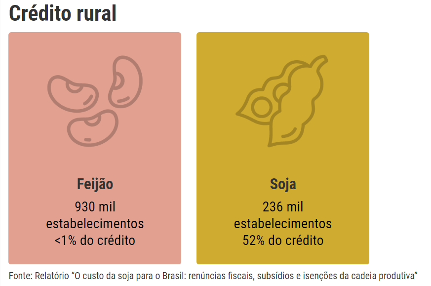 O relatório analisa como essa concentração se reflete na concessão de crédito. Os dados do Banco Central mostram que o grão sugou 52% dos recursos de financiamento em 2022. “Ou seja, de um total de R$ 133,2 bilhões emprestados para custear as lavouras no país, R$ 69,5 bilhões foram destinados para financiar exclusivamente o custeio da soja.”