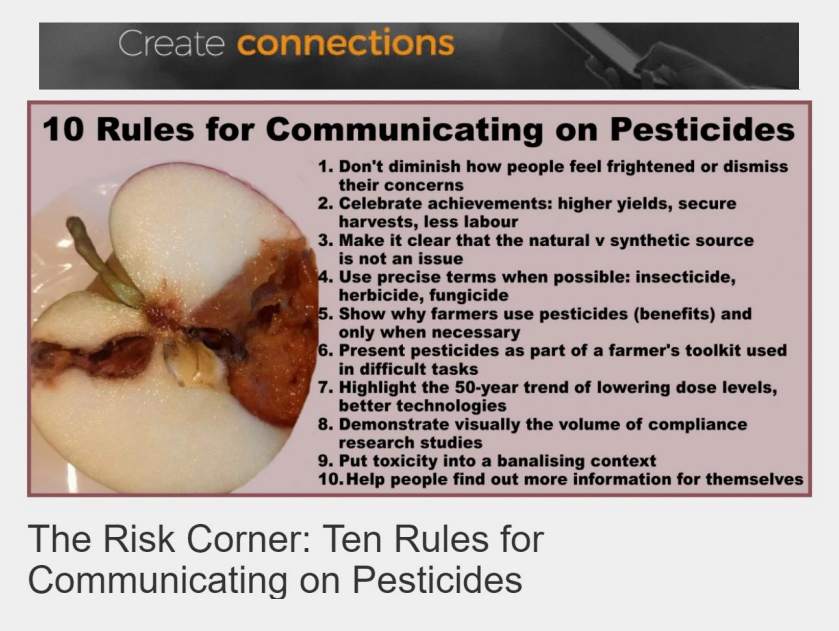 Dez regras de comunicação sobre agrotóxicos foram listadas em uma de suas apresentações como selo do instituto. “Celebre as conquistas: rendimentos mais elevados, colheitas seguras, menos trabalho” é uma das dicas para promover o uso de agrotóxicos. Outra regra diz: “coloque a toxicidade em um contexto banalizado”. Relativizar a toxicidade de substâncias sintéticas, aliás, é tema de várias de suas publicações.