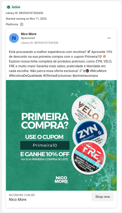 De acordo com o levantamento da reportagem, ao menos três perfis impulsionaram anúncios de snus sintéticos com foco no público brasileiro a partir de novembro no Instagram. Identificamos também outras oito páginas de vendas desses sachês na rede social, sendo que a importação e o comércio desse tipo de produto não são permitidos no país pela falta de marco regulatório, afirmou a Agência Nacional de Vigilância Sanitária (Anvisa) ao Joio.