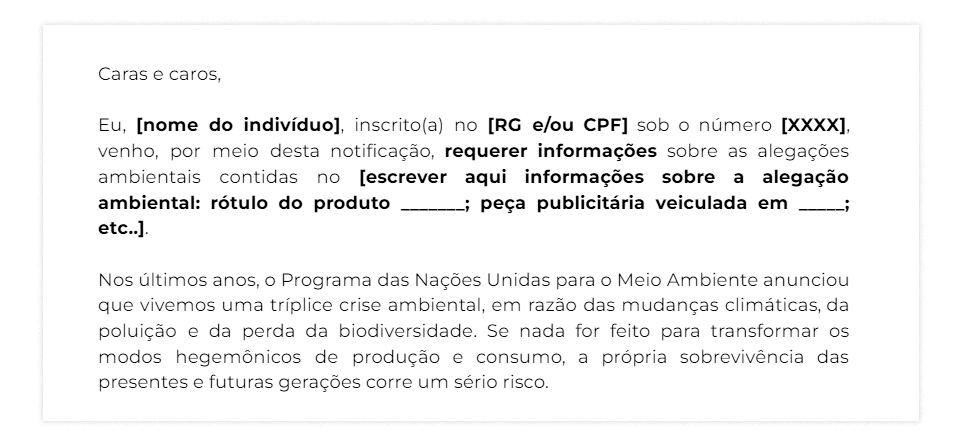 Ao fim, disponibiliza um modelo de carta para quem quer cobrar das empresas provas e explicações sobre suas promessas ambientais. A ideia é fortalecer a pressão pública, exigindo compromisso real com as bases da prosperidade humana.