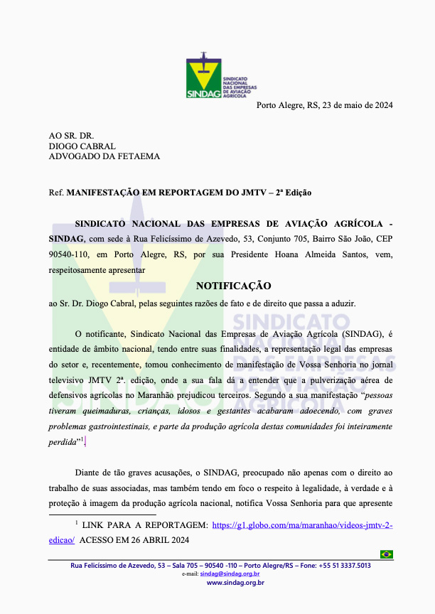 A mesma Federação dos Trabalhadores Rurais do Estado do Maranhão que acompanha esses conflitos entrou para a mira do Sindag. Em 2024, sindicato enviou uma notificação extrajudicial ao advogado popular Diogo Cabral, que representa a Fetaema. Há quatro anos na linha de frente da denúncia de violações de direitos envolvendo a pulverização aérea no estado, Cabral recebeu o documento após dar uma entrevista ao jornal JMTV mencionando contaminações no estado.