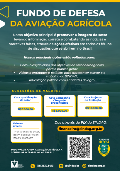 Única representação sindical da aviação agrícola no país, o Sindag reúne 260 empresas associadas. Fundado em 1992 em São Paulo, o sindicato fez o seu début na cena política nacional a partir da aprovação de outra legislação histórica no Brasil, que proibiu a pulverização aérea de agrotóxicos no Ceará em 2019.