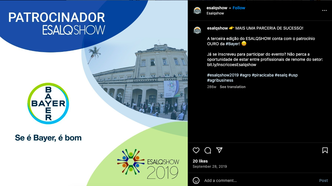 De forma mais escancarada, as empresas patrocinam ou estão presentes em diferentes eventos anuais do campus, como a Feira de Carreiras e a Esalqshow, feira de inovação para o agronegócio que copia o modelo da Agrishow, maior do setor no país.