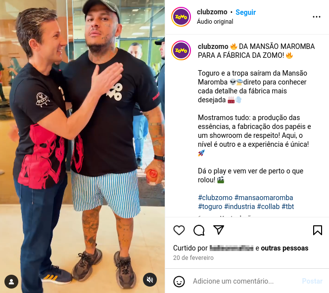 Publicada em fevereiro de 2025, a foto era para o Instagram da Zomo, uma marca paraguaia de essências de narguilé que estava lançando um produto em parceria com a produtora. Até a cor dos biquínis de Willys e Steffens – uma de azul bebê e a outra de rosa-choque – combinava com a embalagem dos maços. O dono da Mansão Maromba, o influenciador fitness Toguro, com quase 20 milhões de seguidores somados YouTube, Instagram e TikTok, também participou das divulgações.