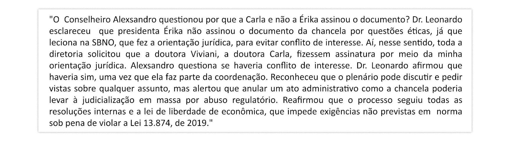 “Ressalto que, nos espaços de representação do CFN, talvez a presidenta Erika Carvalho não devesse se posicionar como sócia-fundadora da Sociedade Brasileira de Nutrição Oncológica (SBNO). Essa entidade tem como principal campo de atuação a oncologia, e essa sobreposição pode gerar conflitos, comprometendo a imparcialidade e a credibilidade da representação institucional do CFN”, declarou Pereira. Seu posicionamento foi corroborado por nove conselheiros e uma funcionária.