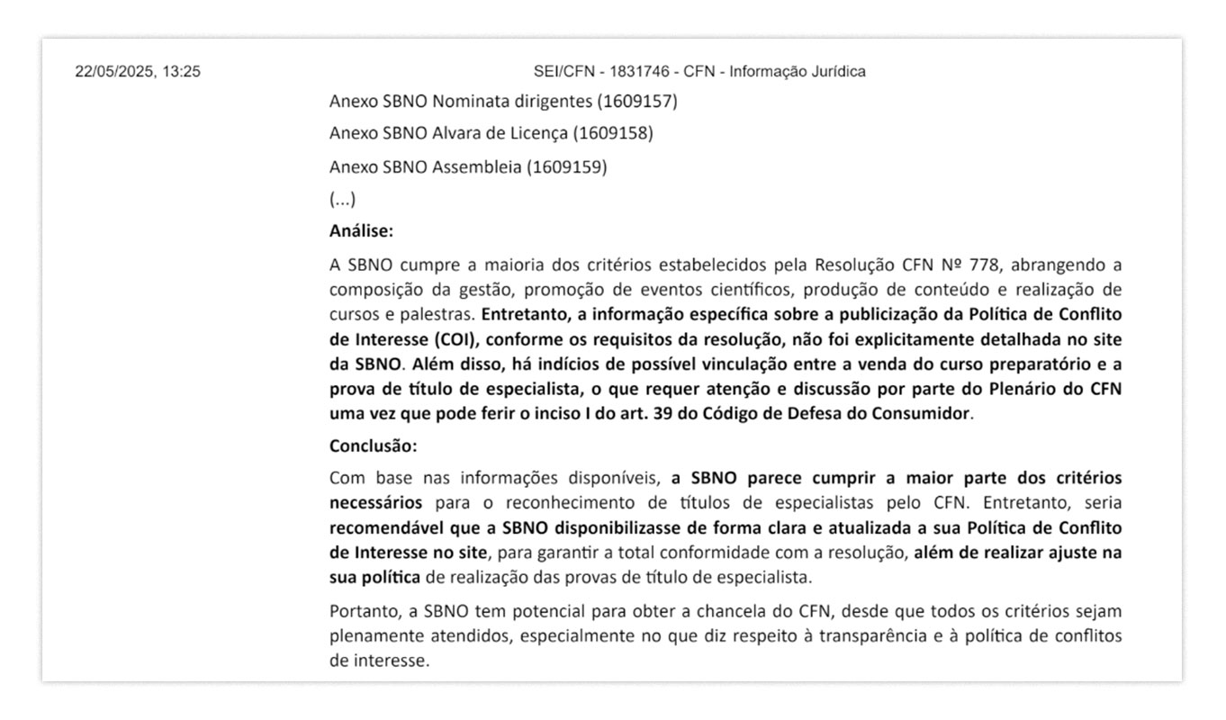 A primeira avaliação do pedido de chancela da SBNO pelo CFN foi em 5 de julho. O parecer jurídico da coordenação à época apontou que a entidade cumpria a maioria dos critérios, mas que a política de conflito de interesses não estava detalhada no site. Também chamava a atenção para o fato de que o nutricionista só poderia fazer a prova do título se estivesse inscrito no curso preparatório oferecido pela própria entidade, o que configura venda casada.