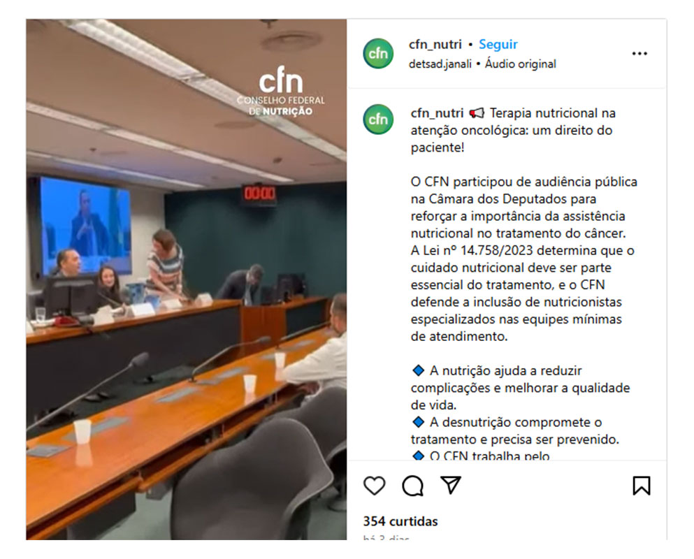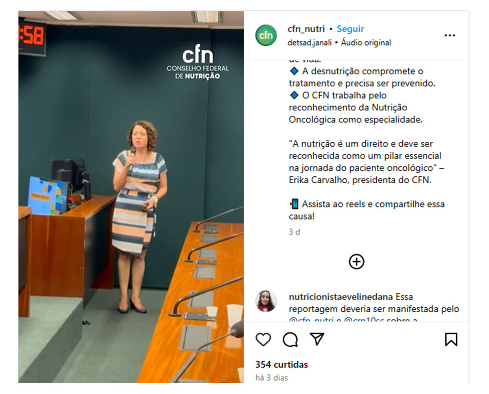 Em postagem no perfil oficial do Instagram do CFN, apagada dias depois, o órgão endossava o tema: “o CFN trabalha pelo reconhecimento da Nutrição Oncológica como especialidade”, lia-se. O assunto nunca foi pautado em plenária e não há nenhum posicionamento público ao longo da história do conselho tratando desta questão, o que causou mal-estar entre os conselheiros.