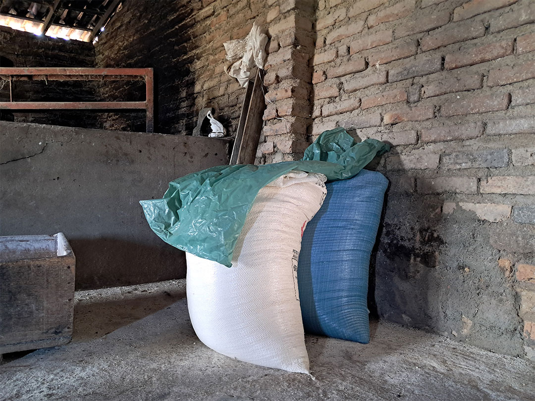 Nas últimas duas semanas, dois sacos de farinha de 50 quilos cada foram produzidos por seu Pedro, com auxílio de um jovem contratado para operar os maquinários e da nora, Bete, na raspagem. Ele me mostra os sacos de ráfia costurados à mão. Seu Pedro e dona Maria do Rosário têm a aposentadoria como a principal fonte de renda hoje em dia, fruto do trabalho como agricultores.