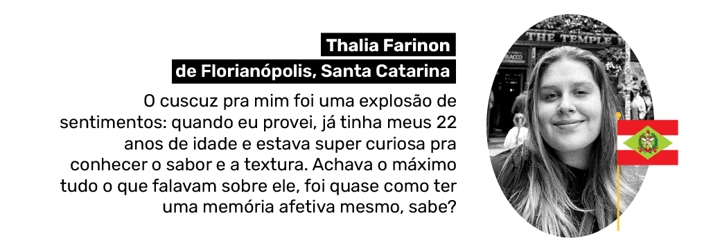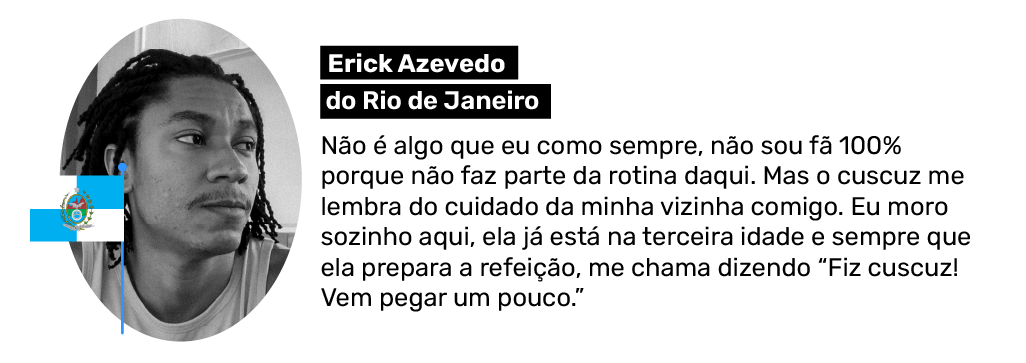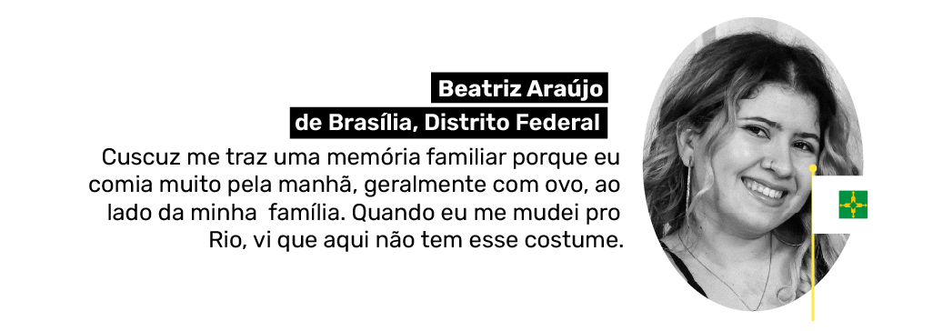 Preciso dizer que precisei dar uma pausa na pesquisa para colocar um cuscuz no fogo. Para mim, enquanto estudante universitária, é um prato acessível, prático para o meu dia a dia, uma “comfort food”. Pensando nisso, conversei com alguns amigos sobre suas memórias de cuscuz e pude passear um pouco ao redor do Brasil a partir dessas perspectivas e sentimentos.