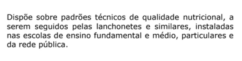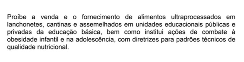 A lei proíbe “alimentos cuja fabricação envolva diversas etapas técnicas de processamento e ingredientes de uso exclusivamente industrial, com altos teores de açúcar e gordura ou contendo em suas composições substâncias químicas sintéticas ou naturais que possam ser prejudiciais à saúde, conforme o Guia Alimentar para a População Brasileira e no Guia Alimentar para Crianças Brasileiras Menores de Dois anos do Ministério da Saúde”.
