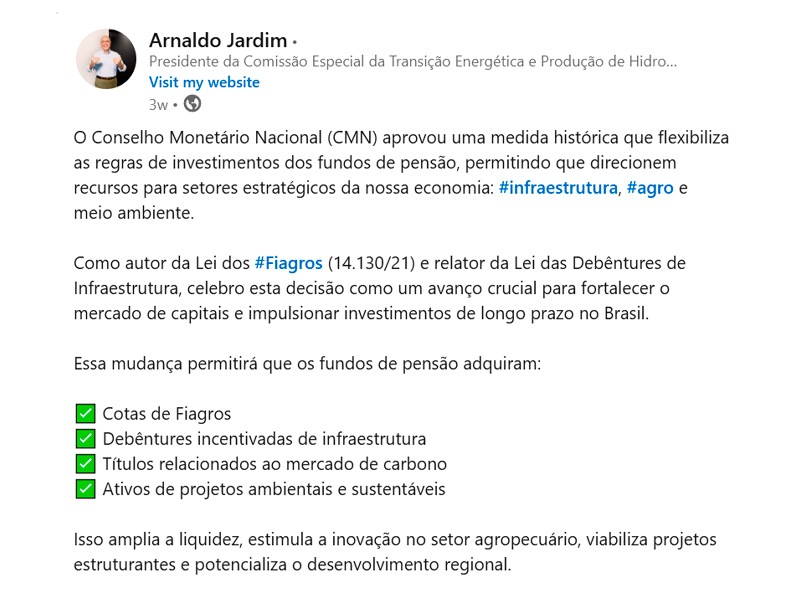Alongside Fiagro, carbon and decarbonization credits have also been added to CMN’s eligible list for pension funds, with a limit of 3% of portfolio assets for these products.