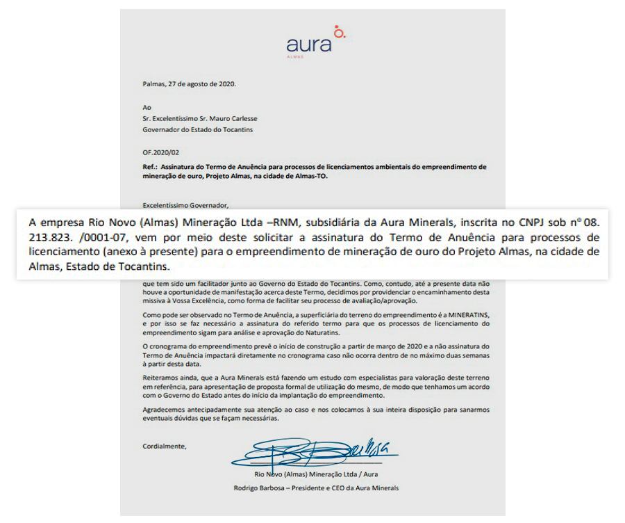 Ambos já haviam se encontrado na sede da mina em 8 de dezembro de 2021, quando o Naturatins entregou a licença ambiental do empreendimento. Na ocasião, Barbosa ressaltou que o governo tinha ciência das responsabilidades ambientais, e que as cobraria dos investidores da Aura.