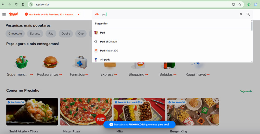O Joio fez uma busca no site da Rappi Brasil usando diferentes localizações dentro da área de abrangência nacional do serviço. Não foi identificado nenhuma venda de dispositivos eletrônicos por meio de buscas de termos “pod”, “vape” e “cigarro eletrônico”. No entanto, marcas destes produtos – incluindo características de quantidade de puffs – aparecem como sugestões na barra de buscas. É como se os produtos estivessem inseridos no ‘catálogo’ de vendas da Rappi, mas seus links inexistentes.
