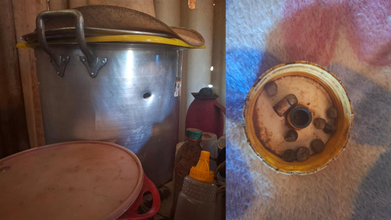 Os atiradores usavam máscaras e se retiraram, mas voltaram quando o sol começou a raiar no dia 5 de novembro. Foi na casa de Giovana, com marcas de tiro no telhado e na porta constatadas pela reportagem, que quatro homens entraram, segundo contou. No seu quarto, um deles a pegou pelos cabelos, apertou sua garganta, empunhou uma faca contra seu pescoço e a ameaçou de morte. Ao se desvencilhar, Giovana saiu correndo e bateu a perna em um banco de madeira. “Gritei muito, pedi a Deus por socorro”, relata, com lágrimas nos olhos. Mancando, mostrou uma panela que ainda está no seu fogão, alvejada bem no meio por um tiro. A bala caiu no chão do seu quarto.