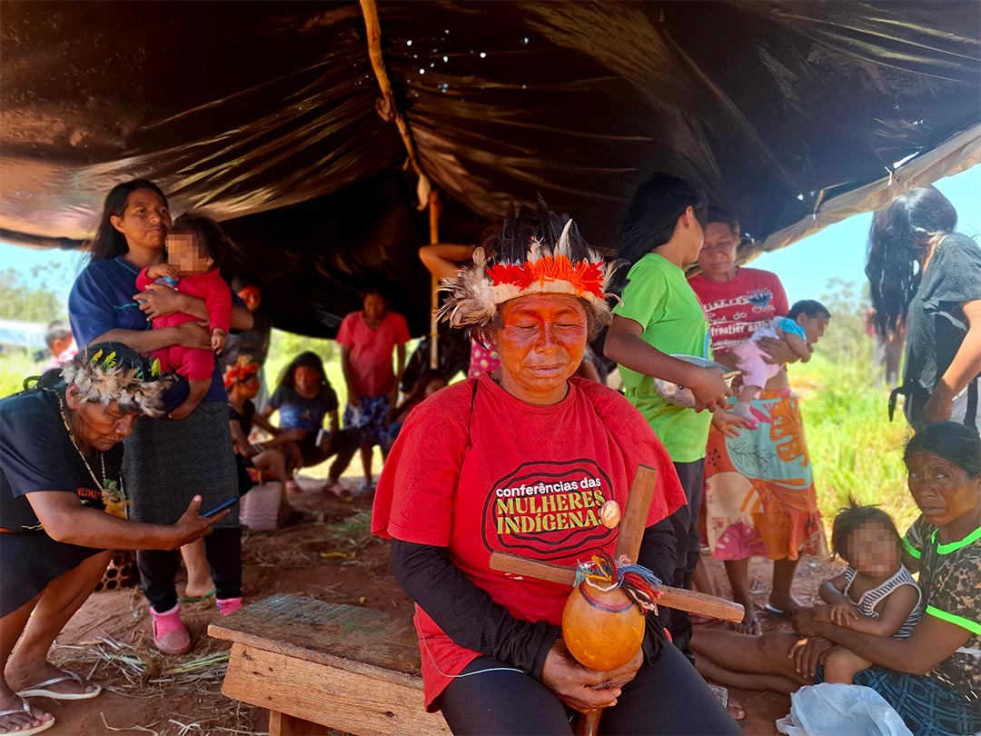 Ele se refere a Loide Teixeira, que se deslocou de Amambai (MS) para Pyelito Kue para fazer a proteção espiritual da comunidade. “Rezei muito para defender a retomada e para ninguém morrer na mão de pistoleiro”, diz Loide, filha de Atanásio Teixeira, um dos maiores e mais respeitados rezadores do povo Guarani Kaiowa, que morreu aos 101 anos em 2023. Durante toda a sua vida, seu Ataná, como era conhecido, lutou para retornar ao território tradicional de Mbaraka’y, de onde foi expulso com sua família, ainda criança.