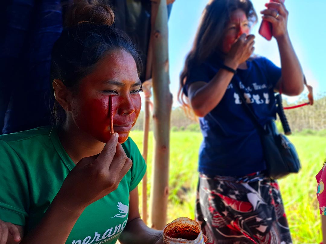 Kuñai carrega o trauma de já ter sido agredida e estuprada por pistoleiros em 2016 quando, grávida de oito meses, perdeu o seu bebê. Tem coragem, no entanto, de integrar a vigília da retomada durante as madrugadas. “Esse território é nosso desde os antigos. Nossa tataravó, avó, cresceram e morreram aqui. O meu tio está enterrado aqui. Então retornamos”, conta, com o rosto pintado de preto e de laranja-urucum.