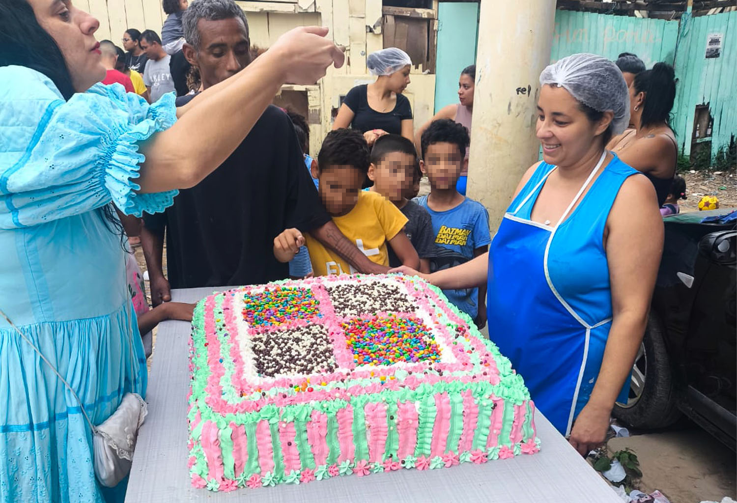 Para a última festa do dia das crianças na Favela do Moinho, a padeira assou um bolo de metro distribuído para boa parte da comunidade.