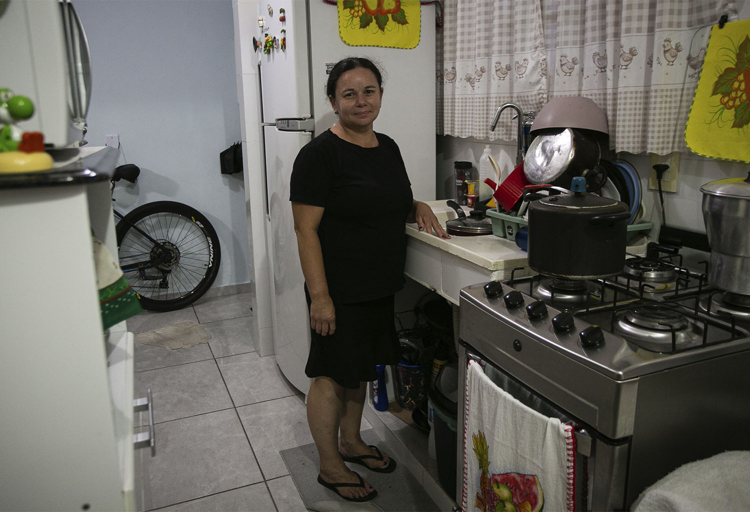 Margarida na cozinha do seu apartamento alugado na Cohab Parque do Gato – Foto: Julia Dolce